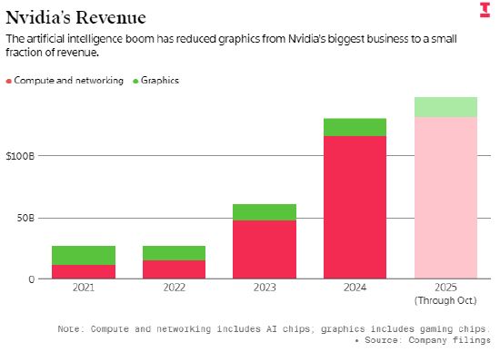 随着人工智能芯片业务的爆发,游戏芯片对英伟达营收利润的重要性已大幅下降。在 2025 年截至 10 月的 9 个月里,游戏显卡业务收入在公司总营收中的占比仅约 8%;而在 2022 年同期,也就是开放式人工智能公司的 ChatGPT 发布、人工智能热潮尚未兴起之时,这一比例高达 35%。