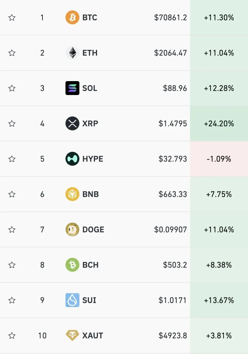 加密货币集体大涨,比特币重返70000美元上方,几乎收复周四加密货币市场崩盘以来全部失地。以太币、狗狗币和Solana均上涨超10%。过去24小时,加密货币全市场超30万人爆仓。