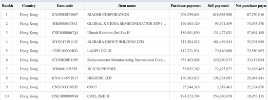 2025年,韩国股民净买入金额排名前10的港股如下:小米集团,净买入8775.06万美元;Global X中国半导体ETF,净买入7403.36万美元;优必选,净买入5760.42万美元;阿里巴巴-W,净买入3370.50万美元;老铺黄金,净买入3358.10万美元;,净买入3311.21万美元;南方东英每日杠杆海力士,净买入732.50万美元;,净买入2504.88万美元;,净买入2222.49万美元;,净买入1995.31万美元。