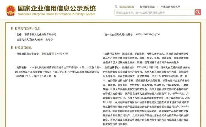 依据《网络反不正当竞争暂行规定》第三十四条、《中华人民共和国反不正当竞争法(2025修订)》第二十五条第一款以及《中华人民共和国行政处罚法》第二十八条的规定,2月6日,莘县市场监督管理局对聊城市鼎友文化传媒有限公司予以行政处罚,罚款65000元,上缴财政。